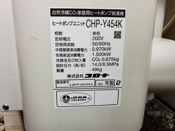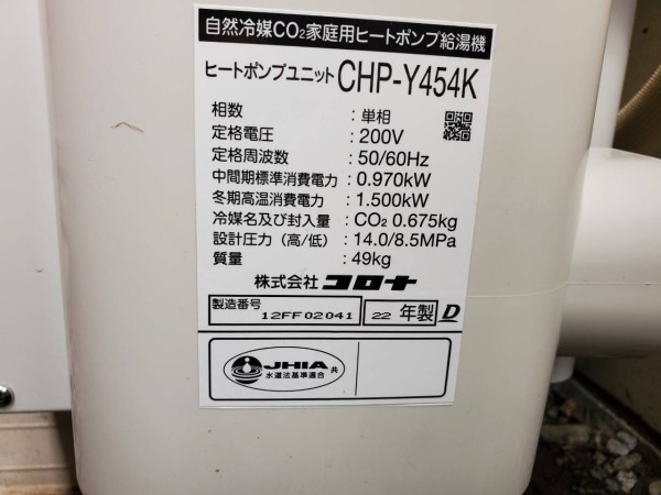 永平寺町大月 コロナ自然冷媒CO2家庭用ヒートポンプ給湯機 貯湯ユニットCTU-37AY5K、ヒートポンプユニットCHP-Y454K エコキュート交換工事|福井県のエコキュート専門交換工事店|福井エコキュート交換ショップ補助金対応可能