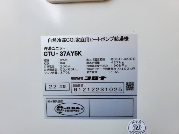 永平寺町大月 コロナ自然冷媒CO2家庭用ヒートポンプ給湯機 貯湯ユニットCTU-37AY5K、ヒートポンプユニットCHP-Y454K エコキュート交換工事