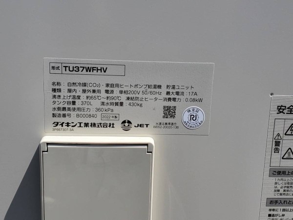 高浜町音海 ダイキン自然冷媒(CO2)・家庭用ヒートポンプ給湯機 貯湯ユニットTU37WFHV エコキュート交換工事|福井県のエコキュート専門交換工事店|福井エコキュート交換ショップ補助金対応可能
