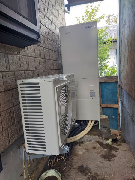 越前町宇田 コロナ自然冷媒CO2家庭用ヒートポンプ給湯機貯湯ユニットCTU-37AY5K、ヒートポンプユニットCHP-Y454K エコキュート交換工事