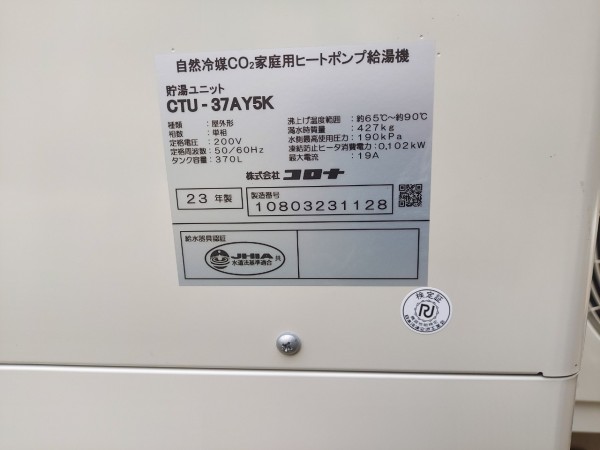 福井市今泉町 コロナ自然冷媒CO2家庭用ヒートポンプ給湯機貯湯ユニットCTU-37AY5K エコキュート交換工事