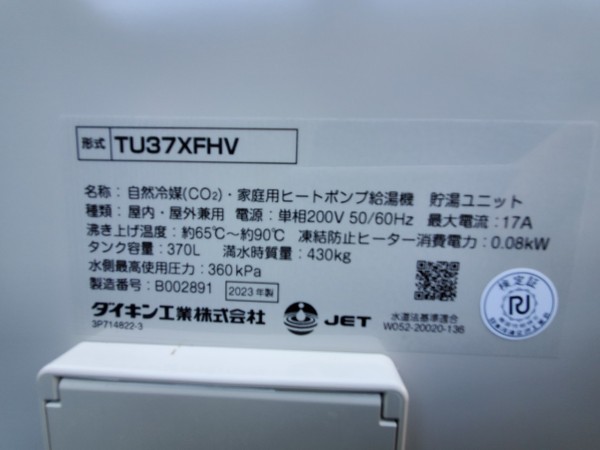 敦賀市御名 ダイキン自然冷媒(CO2)・家庭用ヒートポンプ給湯機貯湯ユニットTU37XFHV エコキュート交換工事|福井県のエコキュート専門交換工事店|福井エコキュート交換ショップ補助金対応可能