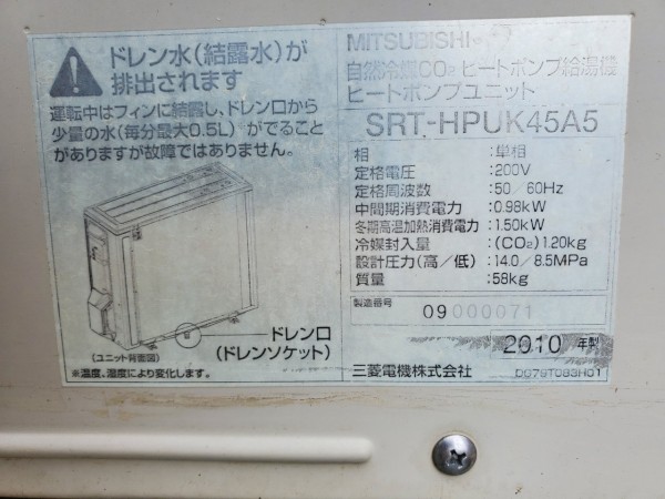福井市今泉町 三菱電機エコキュートSRT-HPUK45A5→コロナ自然冷媒CO2家庭用ヒートポンプ給湯機ヒートポンプユニットCHP-Y454K エコキュート交換工事