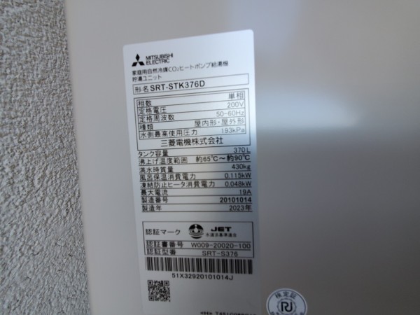 福井市尼ケ谷町 三菱電機エコキュート→三菱電機自然冷媒CO2家庭用ヒートポンプ給湯機貯湯ユニットSRT-STK376D エコキュート交換工事