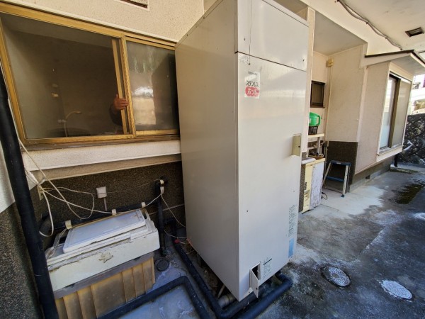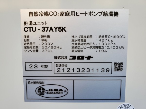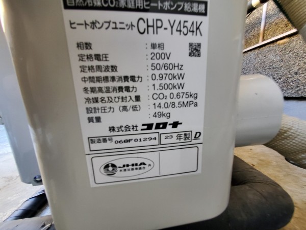 越前町宇田 コロナ自然冷媒CO2家庭用ヒートポンプ給湯機ヒートポンプユニットCHP-Y454K、貯湯ユニットCTU-37AY5K エコキュート交換工事