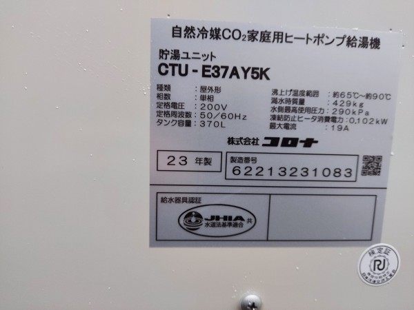 おおい町父子 コロナ自然冷媒CO2家庭用ートポンプ給湯機貯湯ユニットCTU-E37AY5K エコキュート交換工事