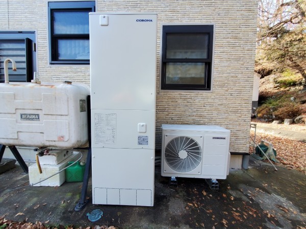 福井市今泉町コロナ自然冷媒CO2家庭用ヒートポンプ給湯機ヒートポンプユニットCHP-Y454K、貯湯ユニットCTU-37AY5K エコキュート交換工事