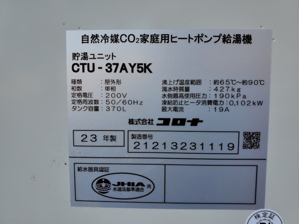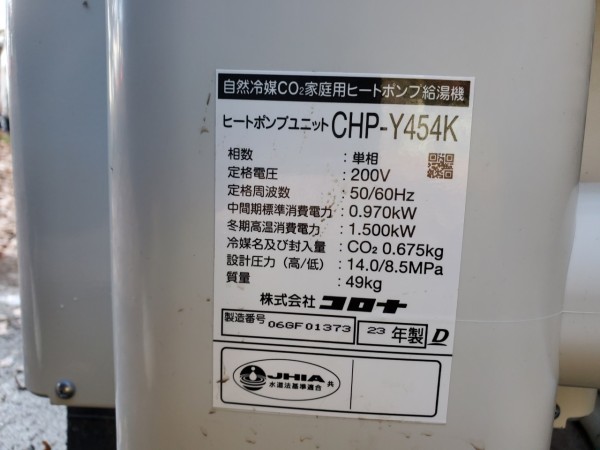 福井市今泉町 コロナ自然冷媒CO2家庭用ヒートポンプ給湯機ヒートポンプユニットCHP-Y454K、貯湯ユニットCTU-37AY5K エコキュート交換工事