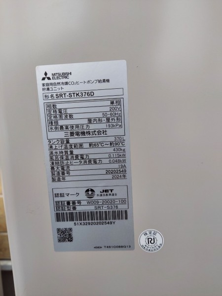 小浜市大戸 三菱電機自然冷媒CO2家庭用ヒートポンプ給湯機貯湯ユニットSRT-STK376D、ヒートポンプユニット エコキュート交換工事