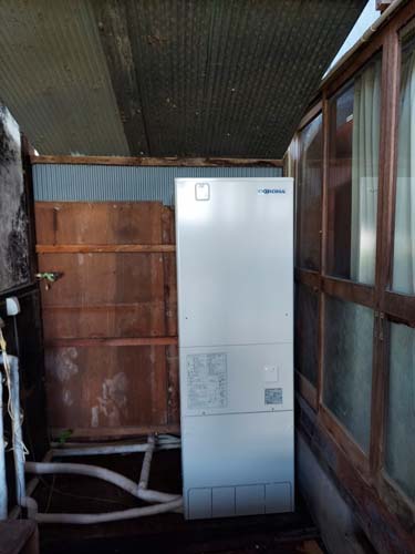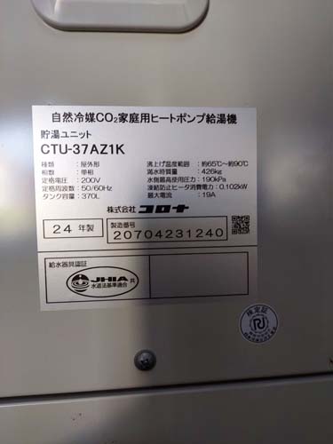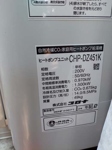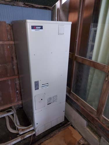 敦賀市小河 三菱電機エコキュート→コロナ自然冷媒CO2家庭用ヒートポンプ給湯機 貯湯ユニットCTU-37AZ1K、ヒートポンプユニットCHP-DZ451K エコキュート交換工事