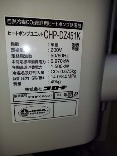 高浜町日置 コロナ自然冷媒CO2家庭用ヒートポンプ給湯機 ヒートポンプユニットCHP-DZ451K エコキュート交換工事
