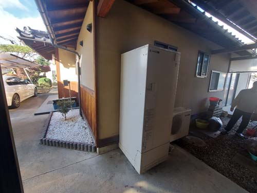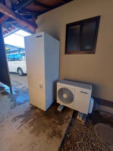 トップページ > 工事事例一覧 > 大野市榎 コロナ自然冷媒CO2家庭用ヒートポンプ給湯機貯湯ユニットCTU-37AZ1K、ヒートポンプユニットCHP-DZ451K エコキュート交換工事