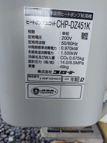 勝山市北市 コロナ自然冷媒CO2家庭用ヒートポンプ給湯機 ヒートポンプユニットCHP-DZ451K エコキュート交換工事