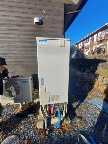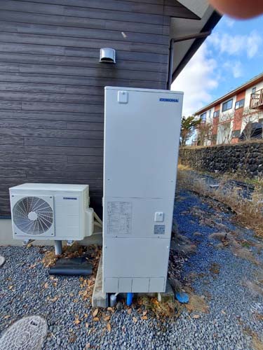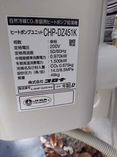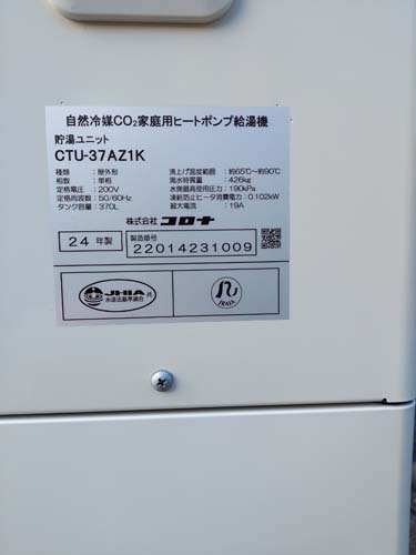 小浜市泊 三菱電機エコキュート→コロナ自然冷媒CO2家庭用ヒートポンプ給湯機貯湯ユニットCTU-37AZ1K、ヒートポンプユニットCHP-DZ451K エコキュート交換工事