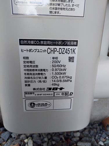 小浜市大戸 コロナ自然冷媒CO2家庭用ヒートポンプ給湯機 ヒートポンプユニットCHP-456K→コロナ自然冷媒CO2家庭用ヒートポンプ給湯機貯湯ユニットCTU-37AZ1K、ヒートポンプユニットCHP-DZ451K エコキュート交換工事