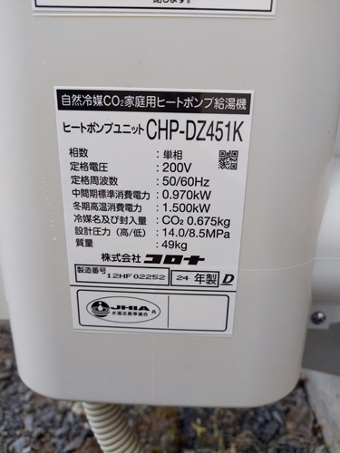永平寺町大月 コロナ自然冷媒CO2家庭用ヒートポンプ給湯機 ヒートポンプユニットCHP-DZ451K エコキュート交換工事