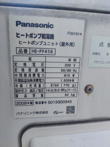 おおい町佐畑 パナソニックヒートポンプ給湯機 ヒートポンプユニットHE-PF45B→コロナ自然冷媒CO2家庭用ヒートポンプ給湯機 ヒートポンプユニットCHP-DZ451K エコキュート交換工事