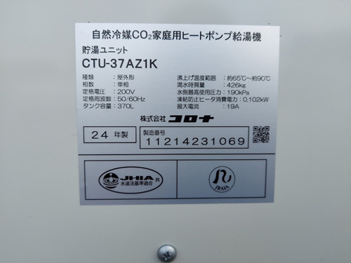 越前町上野 コロナ自然冷媒CO2家庭用ヒートポンプ給湯機貯湯ユニットCTU-37AZ1K、ヒートポンプユニットCHP-DZ451K エコキュート交換工事|福井県のエコキュート専門交換工事店|福井エコキュート交換ショップ補助金対応可能