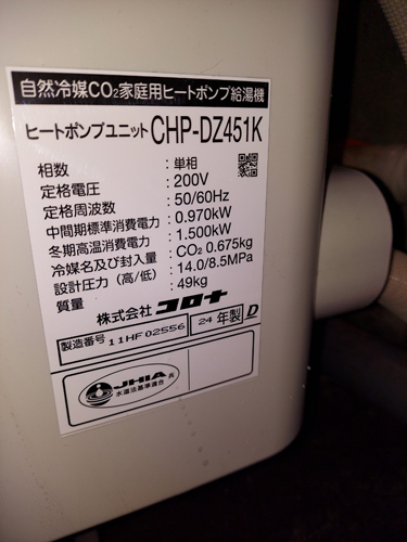 永平寺町大月 コロナ自然冷媒CO2家庭用ヒートポンプ給湯機 ヒートポンプユニットCHP-DZ451K エコキュート交換工事|福井県のエコキュート専門交換工事店|福井エコキュート交換ショップ補助金対応可能