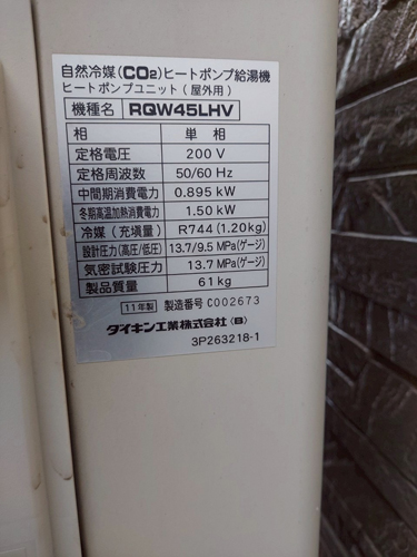 池田町持越 ダイキン自然冷媒CO2ヒートポンプ給湯機ヒートポンプユニットRQW45LHV→コロナ自然冷媒CO2家庭用ヒートポンプ給湯機貯湯ユニットCTU-37AZ1K、ヒートポンプユニットCHP-DZ451K エコキュート交換工事