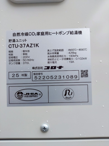 池田町持越 コロナ自然冷媒CO2家庭用ヒートポンプ給湯機貯湯ユニットCTU-37AZ1K、ヒートポンプユニットCHP-DZ451K エコキュート交換工事